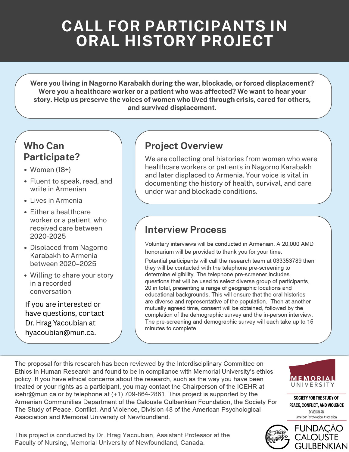 His research program investigates healthcare experiences in diverse settings of crisis, reconciliation, and forced migration. Current projects include documenting the oral histories of women healthcare professionals and patients displaced from Nagorno-Karabakh (Artsakh) to Armenia, as well as exploring Indigenous healthcare students’ perspectives on reconciliation and the Truth and Reconciliation Commission’s Calls to Action within healthcare education in Canada. Across these initiatives, he emphasizes trauma-informed approaches, ethical engagement, and the preservation of marginalized voices.